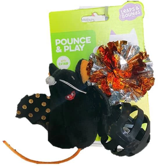 - Includes 3 toys: a bat costumed mouse, a mylar ball, and a ball with a bell