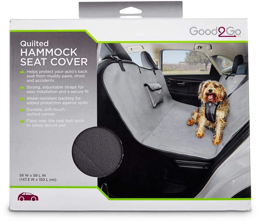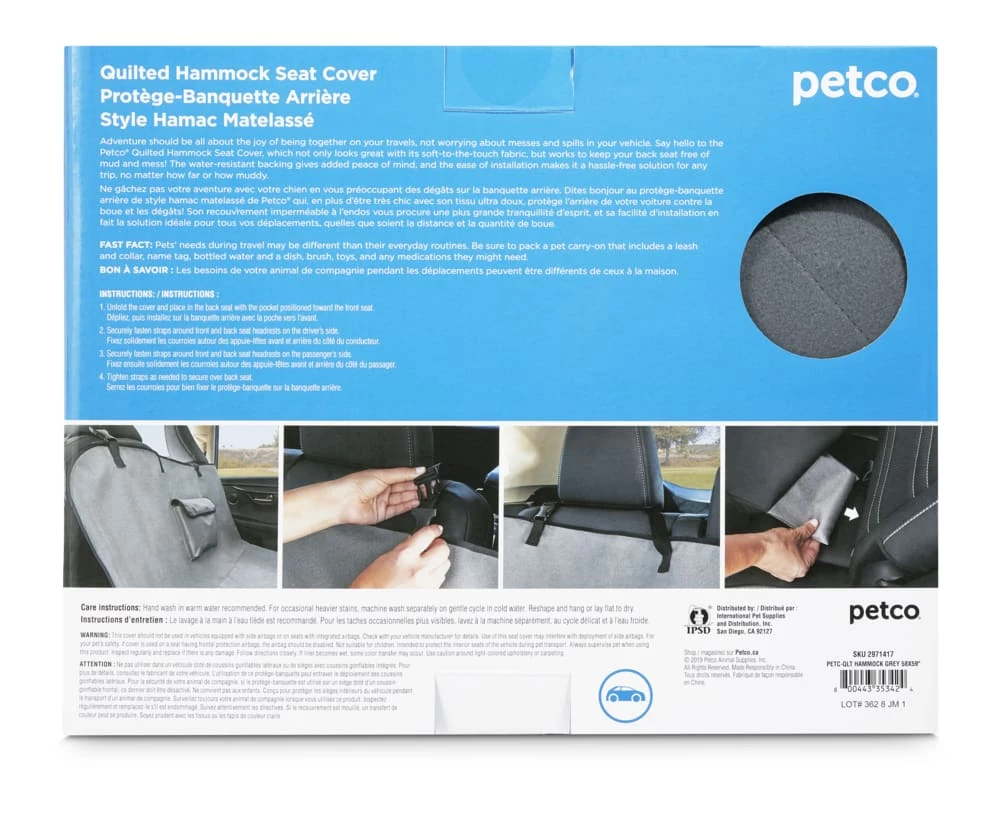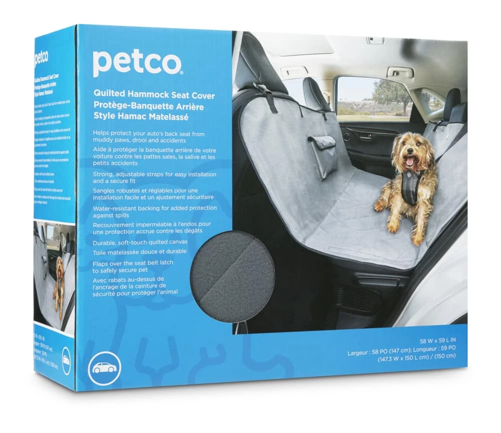 - Petco Quilted Hammock Seat Cover for Pets keeps road trip messes off a car’s interior thanks to an easily adjustable set of straps and a water-resistant backing